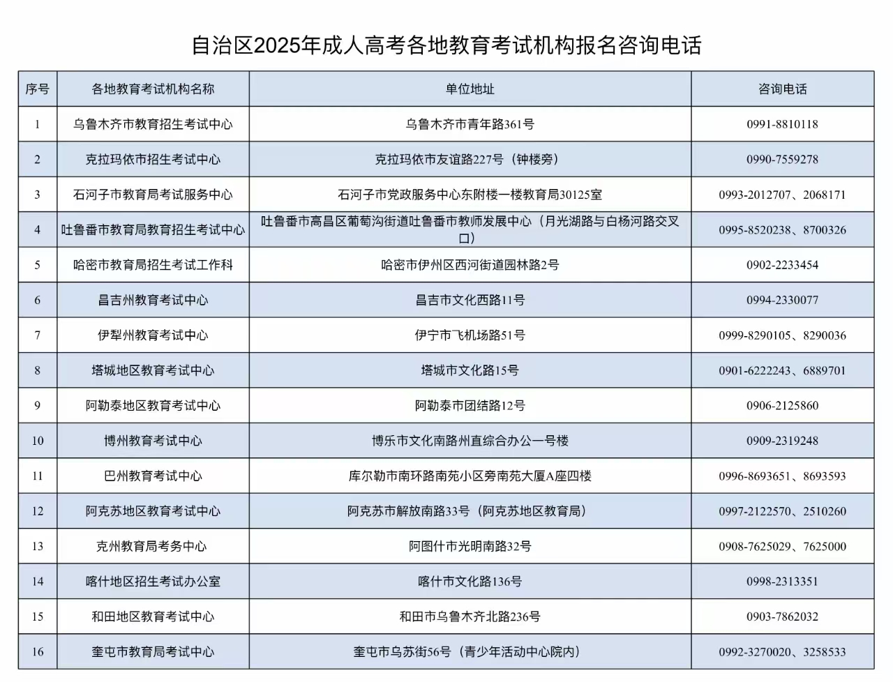 10月10日12时起,完成报考审核、缴费的考生在新疆教育考试院官方网站自行下载打印准考证。自治区2025年成人高考全疆共设16个考区,考点设在各地、州、市人民政府(行署)所在地的国家教育考试标准化考点。考生所选考区一经确认无法更改,因考区选择错误无法参加考试的考生,责任由考生个人承担。最终考点以考生《准考证》信息为准。