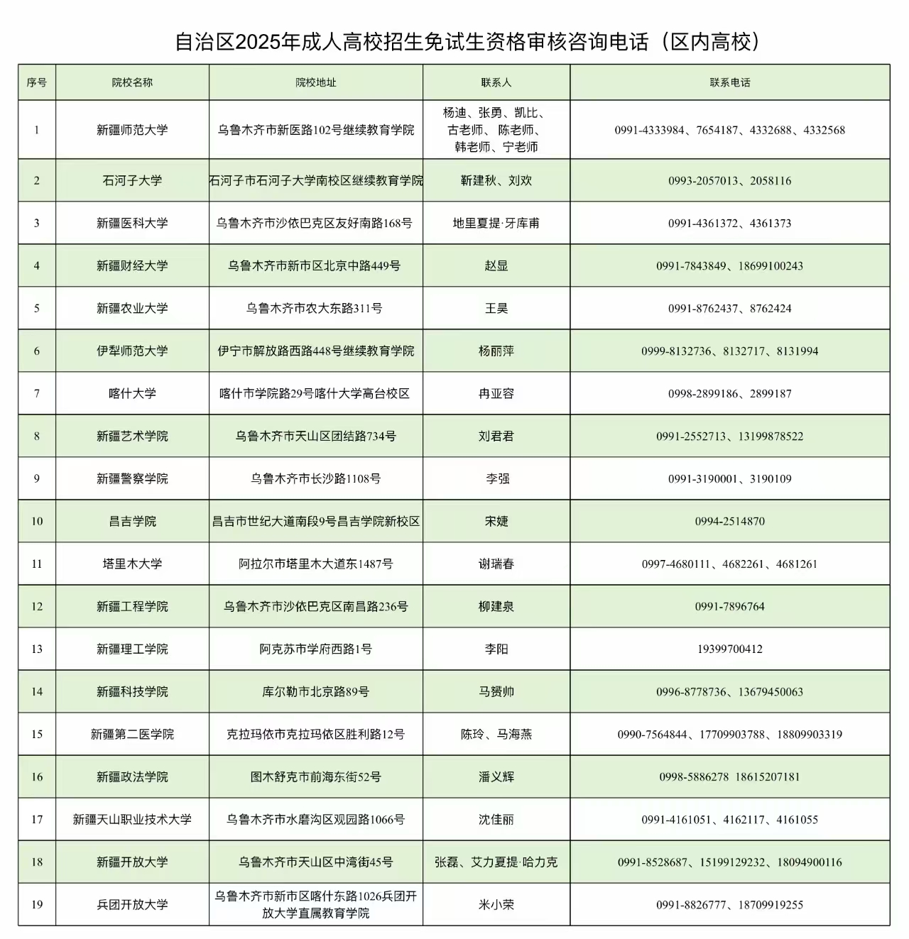 考生可登录新疆教育考试院官方网站查看《关于做好新疆维吾尔自治区2025年成人高校考试招生工作的通知》详细内容。《新疆维吾尔自治区2025年成人高校招生照顾加分登记表》《新疆维吾尔自治区2025年成人高校招生免试入学申请表》考生在自治区教育考试院官方网站下载。
